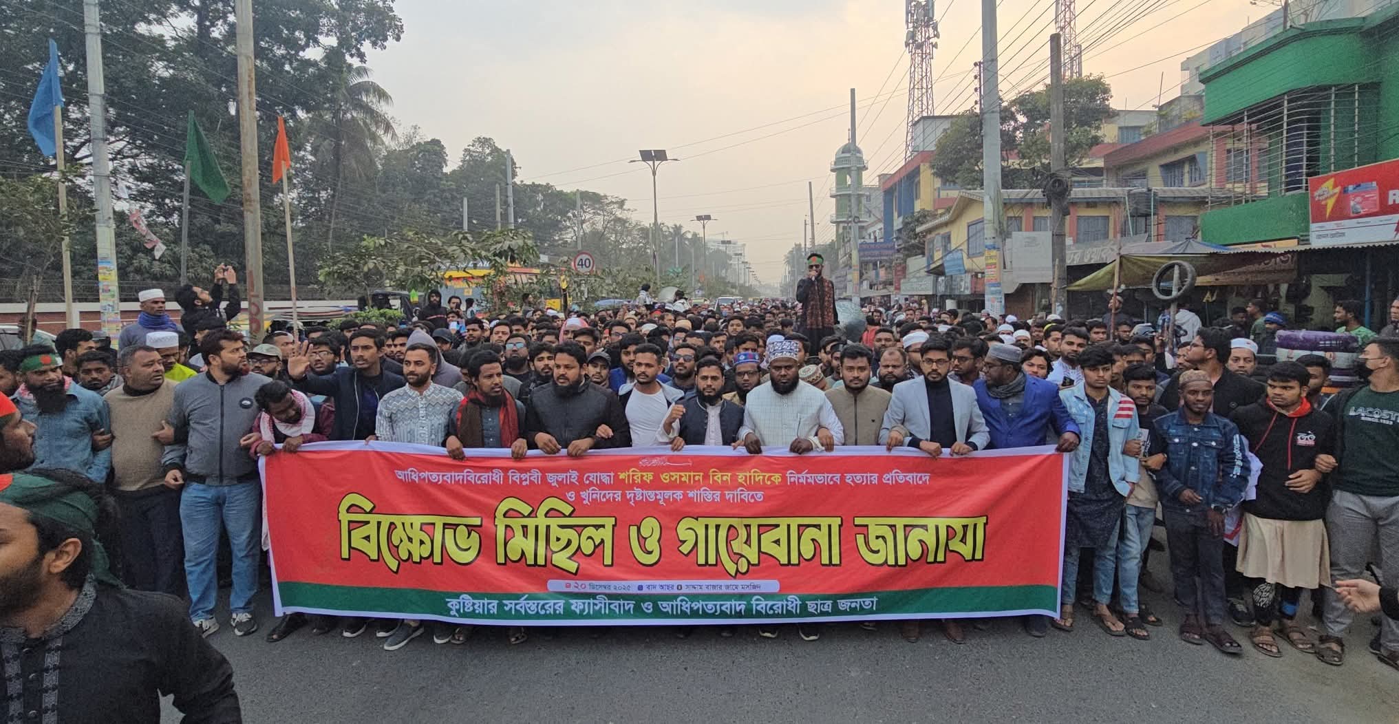 শনিবার বিকেল চারটার দিকে কুষ্টিয়া শহরের সাদ্দাম বাজার মোড় থেকে ‘কুষ্টিয়ার সর্বস্তরের ফ্যাসিবাদ ও আধিপত্যবাদ বিরোধী ছাত্র-জনতা’র ব্যানারে একটি বিক্ষোভ মিছিল বের হয়। মিছিলটি শহরের প্রধান প্রধান সড়ক প্রদক্ষিণ করে। এসময় অংশগ্রহণকারীরা শরিফ ওসমান বিন হাদির হত্যাকারীদের ফাঁসি এবং আধিপত্যবাদের বিরুদ্ধে বিভিন্ন স্লোগান দেন। মিছিলটি মজমপুর গেট অতিক্রম করে শহরের কেন্দ্রস্থল পাঁচ রাস্তার মোড়ে গিয়ে সংক্ষিপ্ত সমাবেশে মিলিত হয়।