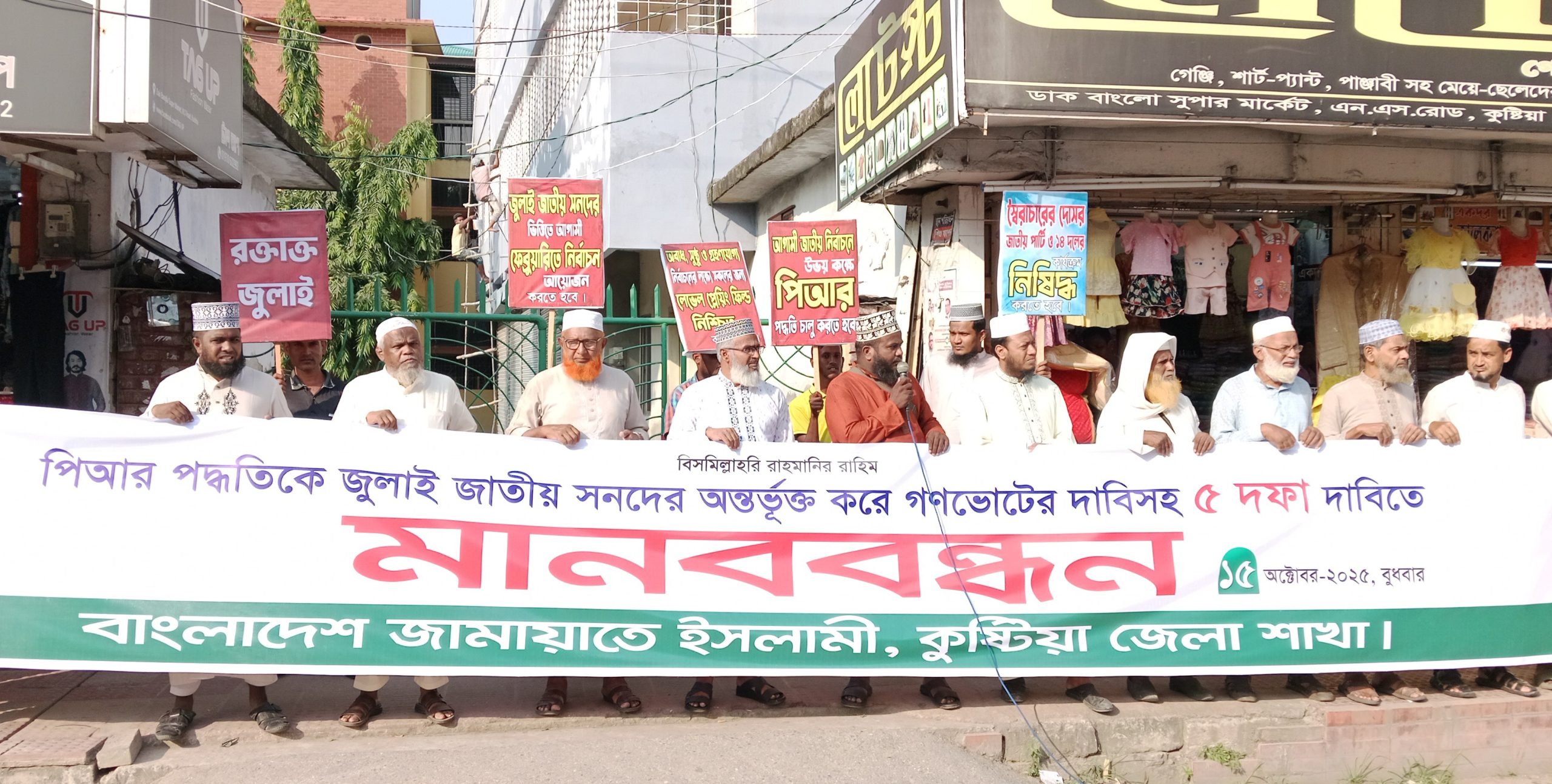 জুলাই জাতীয় সনদে পিআর (প্রোপোরশনাল রিপ্রেজেন্টেশন) পদ্ধতি অর্ন্তভূক্ত করে গণভোটের দাবিসহ পাঁচ দফা দাবিতে বাংলাদেশ জামায়াতে ইসলামী কুষ্টিয়া জেলা শাখার উদ্যোগে এক বিশাল মানববন্ধন অনুষ্ঠিত হয়েছে। গতকাল বুধবার (১৫ অক্টোবর) বিকাল সাড়ে ৩টার দিকে কুষ্টিয়া শহরের মজমপুর গেট থেকে বড়বাজার পর্যন্ত দীর্ঘ এ মানববন্ধনে জেলার বিভিন্ন উপজেলা ও ইউনিয়ন থেকে হাজারো নেতা-কর্মী অংশ নেন। অনুষ্ঠানটি পরিচালনা করেন কুষ্টিয়া জেলা জামায়াতে ইসলামীর সেক্রেটারি সুজা উদ্দিন জোয়ার্দ্দার। প্রধান অতিথি হিসেবে বক্তব্য রাখেন কুষ্টিয়া জেলা জামায়াতে ইসলামীর আমীর মাওলানা আবুল হাসেম। মানববন্ধনে বক্তারা বলেন, দেশের গণতন্ত্র পুনরুদ্ধার, সুষ্ঠু নির্বাচন এবং জনগণের ভোটাধিকার নিশ্চিত করতে পিআর পদ্ধতি সংযোজন ও গণভোটের মাধ্যমে জনগণের মতামত নেওয়া জরুরি। মানববন্ধনে আরও বক্তব্য রাখেন বাংলাদেশ জামায়াতে ইসলামীর কেন্দ্রীয় মজলিসে শুরার সদস্য অধ্যাপক ফরহাদ হুসাইন, কুষ্টিয়া জেলা জামায়াতের ইসলামীর নায়েবে আমীর ও কুষ্টিয়া-২ (মিরপুর-ভেড়ামারা) আসনের প্রার্থী আব্দুল গফুর, কুষ্টিয়া-৩ সদর আসনের প্রার্থী হাফেজ মুফতি মাওলানা আমীর হামজা, জেলা জামায়াতের সহকারী সেক্রেটারি খায়রুল ইসলাম রবিন এবং শহর জামায়াতের আমীর এনামুল হক প্রমুখ। বক্তারা বলেন, দেশের জনগণ এখন পরিবর্তন চায়। সেই পরিবর্তনের সূচনা হতে হবে গণতান্ত্রিক পদ্ধতিতে, যেখানে প্রতিটি ভোটের মূল্য থাকবে এবং সকল দল নির্বাচনে অংশগ্রহণের সমান সুযোগ পাবে। বক্তারা জামায়াতের ঘোষিত পাঁচ দফা দাবি তুলে ধরেন। দাবীগুলোর মধ্যে রয়েছে – জুলাই জাতীয় সনদ বাস্তবায়ন করে গণভোটের মাধ্যমে আগামী ফেব্রুয়ারিতে জাতীয় নির্বাচন আয়োজন। আসন্ন জাতীয় নির্বাচনে উভয় কক্ষে পিআর পদ্ধতি অন্তর্ভুক্ত করে গণভোট প্রদান। অবাধ, সুষ্ঠু ও গ্রহণযোগ্য নির্বাচনের জন্য সকলের জন্য সমান সুযোগ (লেভেল প্লেয়িং ফিল্ড) নিশ্চিত করা। বর্তমান সরকারের সকল জুলুম-নির্যাতন, গণহত্যা ও দুর্নীতির বিচার দৃশ্যমান করা। স্বৈরাচারের দোসর জাতীয় পার্টি ও ১৪ দলের রাজনৈতিক কার্যক্রম নিষিদ্ধ ঘোষণা।