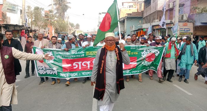 নির্বাচনী প্রচারণার শেষ দিনে কুষ্টিয়ার ভেড়ামারায় বর্ণাঢ্য গণমিছিল ও সমাবেশ করেছে জামায়াতে ইসলামী। গতকাল সোমবার (৯ ফেব্রুয়ারি) বিকেল ৩টার দিকে ভেড়ামারা সরকারি পাইলট মডেল উচ্চ বিদ্যালয় মাঠ থেকে মিছিলটি শুরু হয়। এরপর শহরের প্রধান প্রধান সড়ক প্রদক্ষিণ করে বাসট্যন্ডে এসে শেষ হয়। মিছিল পূর্ব স্কুল মাঠে এক সংক্ষিপ্ত সমাবেশ অনুষ্ঠিত হয়। এতে প্রধান অতিথির বক্তব্যে রাখেন কুষ্টিয়া জেলা জামায়াতের ভারপ্রাপ্ত আমির ও কুষ্টিয়া-২ (মিরপুর-ভেড়ামারা) আসনের জামায়াতের সংসদ সদস্য প্রার্থী আলহাজ্ব আব্দুল গফুর। জেলা জামায়াতের প্রশিক্ষণ বিষয়ক সম্পাদক ড. নুরুল আমিন জসিমের পপরিচালনায় সমাবেশে বিশেষ অতিথির বক্তৃতা করেন বাংলাদেশ খেলাফত মজলিসের কুষ্টিয়া জেলা নায়েবে আমীর মুন্সি ময়নুল হক, এনসিপির কুষ্টিয়া জেলা সমন্বয়ক জান্নাতুল ফেরদৌস টনি, এনসিপি জাপানের সমন্বয়কারী ইঞ্জিনিয়ার সৈয়দা শাম্মি আক্তার সুইট, মিরপুর উপজেলা জামায়াতের আমীর খন্দকার রেজাউল করিম, সেক্রেটারি মো. মহিউদ্দিন, ভেড়ামারা উপজেলা আমির মোঃ জালাল উদ্দিন, সাধারণ সম্পাদক শফিকুল আলম, সহ-সম্পাদক মোঃ তারেক আহমেদ প্রমুখ। এসময় আব্দুল গফুর বলেন, চারিদিকে জামায়াতের জোয়ার শুরু হয়েছে। শহর থেকে গ্রাম সকল এলাকায় সকল গণমানুষের কন্ঠে শুধু দাঁড়িপাল্লার প্রতিধ্বনি। দেশের মানুষ দুর্নীতিবাজ আর চাঁদাবাজদের রাষ্ট্র ক্ষমতায় দেখতে চায় না। আগামীতে ইনশাল্লাহ জামায়াতে ইসলামী জনগণের সমর্থন নিয়ে কুষ্টিয়া-২ আসন সহ সারা দেশে ব্যাপক সংখ্যক আসন নিয়ে রাষ্ট্র ক্ষমতায় যাবে ইনশাল্লাহ।