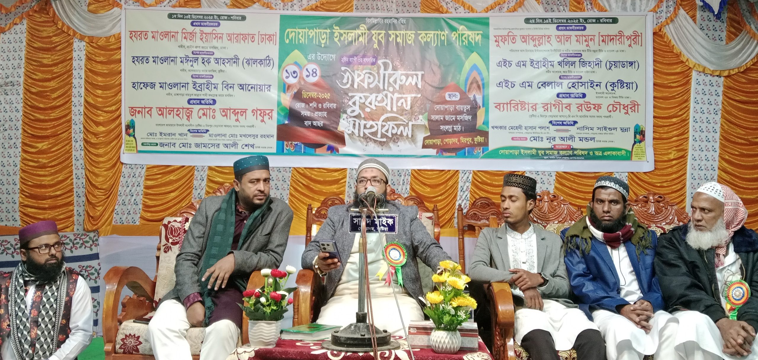 কুষ্টিয়ার মিরপুর উপজেলার পোড়াদহ ইউনিয়নের দোয়াপাড়া ইসলামী যুব সমাজ কল্যান পরিষদের উদ্যোগে ২দিন ব্যাপী ৩য় বাৎসরিক তাফসীরুল কোরআন মাহফিলের ১ম দিনের মাহফিল অনুষ্ঠিত হয়েছে। গতকাল শনিবার (১৩ ডিসেম্বর) রাতে দোয়াপাড়া বাইতুস সালাম জামে মসজিদ সংলগ্ন মাঠে এ মাহফিল অনুষ্ঠিত হয়েছে। মাহফিলে প্রধান তাফসীরকারক হিসেবে ওয়াজ করেছেন ঢাকাস্ত প্রাইম গ্রুপ জামে মসজিদের খতীব হযরত মাওলানা মির্জা ইয়াসিন আরাফাত।বিশেষ তাফসীরকারক হিসেবে বক্তব্য রাখেন কুষ্টিয়া কলেজ মোড় জামে মসজিদের খতিব হযরত মাওলানা মঈনুল হক আহসানী (ঝালকাঠি)।ডাঙ্গাপাড়া বাইতুল জান্নাত শাহী কমপ্লেক্স জামে মসজিদের খতীব হাফেজ মাওলানা ইব্রাহীম বিন আনোয়ার।প্রধান অতিথি জামায়াত মনোনীত কুষ্টিয়া ০২ আসনে এমপি প্রার্থী আব্দুল গফুরের প্রতিনিধি হিসেবে উপস্থিত ছিলেন পোড়াদহ ইউনিয়ন জামায়াতের আমীর বাবুল আক্তার।বিশেষ অতিথি হিসেবে উপস্থিত ছিলেন আইলচারা কলেজের প্রভাষক ও গ্রামীণ অটো ফ্লাওয়ার মিলের ব্যাবস্থাপনা পরিচালক মোঃ ইমরান খান,ডাঙ্গাপাড়া দাখিল মাদ্রাসার সাবেক সহ সুপার মাওলানা মোঃ মখলেসুর রহমান।সভাপতিত্ব করেন বিশিষ্ট সমাজসেবক জামসের আলী শেখ।এসময় আরো উপস্থিত ছিলেন দোয়াপাড়া ইসলামী যুব সমাজ কল্যান পরিষদের উপদেষ্টা মন্ডলীর অন্যতম সদস্য ইমরান আলী সুমন,সভাপতি মো: হাসান,সেক্রেটারি রানা আহমেদ,কোষাধ্যক্ষ লিংকন আহমেদসহ স্থানীয় বিশিষ্ট ব্যাক্তিবর্গ।