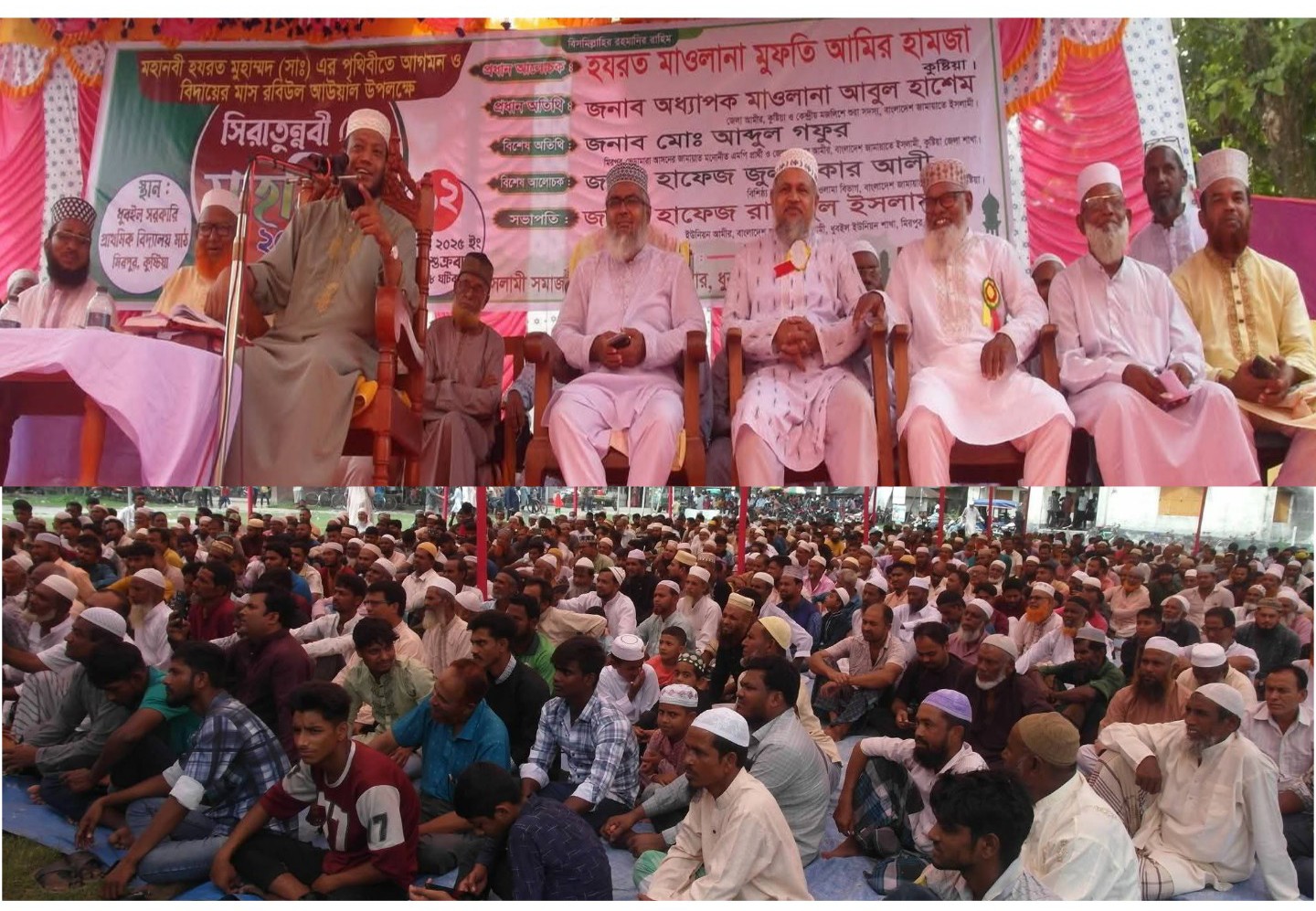 কুষ্টিয়ার মিরপুরে ধুবইল ইউনিয়ন ইসলামী সমাজ কল্যাণ সংঘ ও পাঠাগারের আয়োজনে শুক্রবার (১২ সেপ্টেম্বর) সকাল ৮ টায় ধুবইল সরকারী প্রাথমিক বিদ্যালয় মাঠে সিরাতুন্নবী (সাঃ) মাহফিল অনুষ্ঠিত হয়েছে। উক্ত মাহফিলের প্রধান আলোচক ছিলেন কুষ্টিয়ার কৃতি সন্তান বিশিষ্ট ইসলামী চিন্তাবিদ কুষ্টিয়া-৩ আসনের সংসদ সদস্য পদপ্রার্থী হযরত মাওলানা মুফতী আমির হামজা।প্রধান অতিথি ছিলেন বাংলাদেশ জামায়াতে ইসলামী কেন্দ্রীয় সুরা সদস্য ও কুষ্টিয়া জেলা জামায়াতে ইসলামীর আমীর, লেখক ও গবেষক অধ্যাপক মাওলানা আবুল হাশেম। বিশেষ অতিথি হিসেবে উপস্থিত ছিলেন জেলা জামায়াতে ইসলামীর নায়েবে আমীর,মিরপুর উপজেলা পরিষদের সাবেক চেয়ারম্যান ও কুষ্টিয়া-২ মিরপুর -ভেড়ামারা আসনের সংসদ সদস্য পদপ্রার্থী জননেতা আলহাজ্জ আব্দুল গফুর।বিশেষ আলোচক হিসেবে উপস্থিত ছিলেন কুষ্টিয়া জেলা শাখা বাংলাদেশ জামায়াতে ইসলামী উলামা বিভাগের আমীর হাফেজ মাওলানা জুলফিকার আলী। বিশেষ অতিথি ছিলেন মিরপুর উপজেলা জামায়াতে ইসলামীর আমীর, হযরত মাওলানা খন্দকার রেজাউল করীম প্রমুখ। সভাপতিত্ব করেন ১৩ নং ধুবইল ইউনিয়ন শাখার আমীর হাফেজ মোঃ রাজিবুল ইসলাম, সার্বিক তত্বাবধায়নে ছিলেন ১৩ নং ধুবইল ইউনিয়ন জামায়াতে ইসলামী সেক্রেটারী মোঃ মিজানুর রহমান মজনু, অনুষ্ঠান পরিচালনা করেন বাংলাদেশ জামায়াতে ইসলামী উলামা বিভাগ আমীর মোঃ আজগার আলী।