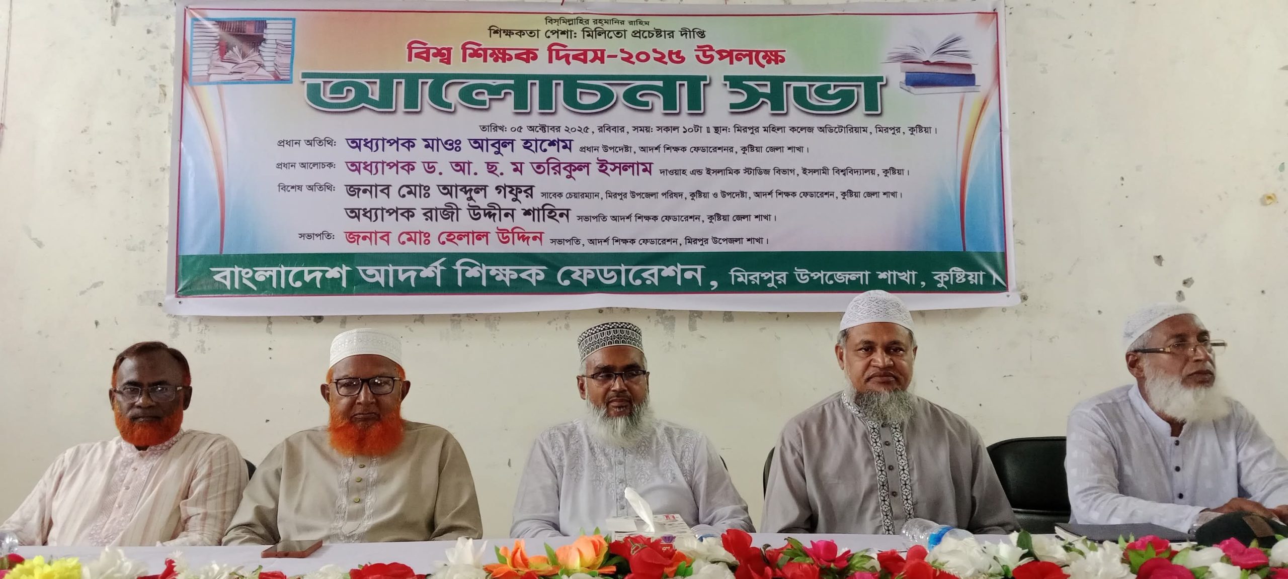 ‘শিক্ষকতা পেশা: মিলিতো প্রচেষ্টার দীপ্তি” প্রতিপাদ্য নিয়ে কুষ্টিয়ার মিরপুরে বিশ্ব শিক্ষক দিবস-২০২৫ পালিত হয়েছে। বাংলাদেশ আদর্শ শিক্ষক ফেডারেশন, মিরপুর উপজেলা শাখার আয়োজনে আজ রবিবার (০৫ অক্টোবর) মিরপুর মহিলা ডিগ্রী কলেজ অডিটোরিয়ামে এ উপলক্ষে এক আলোচনা সভা অনুষ্ঠিত হয়েছে।পরে সেখান থেকে এক বর্ণ্যাঢ্য র্যালী বের হয়ে মিরপুর বাজারের বিভিন্ন সড়ক প্রদক্ষিন শেষে মিরপুর ঈগল চত্বরে শেষ হয়। আদর্শ শিক্ষক ফেডারেশন, মিরপুর উপেজলা শাখার সভাপতি হেলাল উদ্দিন সভাপতিত্বে অনুষ্ঠানে প্রধান অতিথি হিসেবে বক্তব্য রাখেন আদর্শ শিক্ষক ফেডারেশনর কুষ্টিয়া জেলা শাখার প্রধান উপদেষ্টা অধ্যাপক মাওঃ আবুল হাশেম। প্রধান আলোচক হিসেবে বক্তব্য রাখেন ইসলামী বিশ্ববিদ্যালয়, কুষ্টিয়ার দাওয়াহ এন্ড ইসলামিক স্টাডিজ বিভাগের অধ্যাপক ড. আ. ছ. ম তরিকুল ইসলাম। বিশেষ অতিথি হিসেবে বক্তব্য রাখেন মিরপুর উপজেলা পরিষদের সাবেক চেয়ারম্যান ও আদর্শ শিক্ষক ফেডারেশন, কুষ্টিয়া জেলা শাখার উপদেষ্টা আব্দুল গফুর। আদর্শ শিক্ষক ফেডারেশন, কুষ্টিয়া জেলা শাখার সভাপতি অধ্যাপক রাজী উদ্দীন শাহিন। এ সময় বক্তারা বলেন – জাতির শ্রেষ্ঠ সন্তান গড়ার কারিগর শিক্ষকদের সামাজিক ও রাষ্ট্রীয়ভাবে মূল্যায়ন করতে হবে। শিক্ষকদের বিভিন্ন সুযোগ সুবিধার কথা মৌখিকভাবে আশ্বাস দিলেও পরবর্তীতে তা বাস্তবায়নের আলোর মুখ দেখেনি।