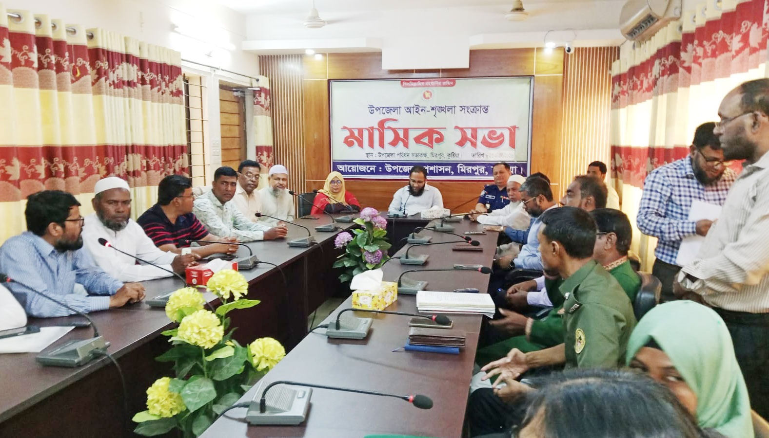 কুষ্টিয়ার মিরপুরে উপজেলা আইন—শৃঙ্খলা কমিটির মাসিক সভা অনুষ্ঠিত হয়েছে। সভায় আইনশৃঙ্খা পরিস্থিতি, মাদক, বাল্যবিয়ে ও জ্বালানি তেল সহ নানা বিষয়ে বিস্তর আলোচনা হয়। বৃহস্পতিবার সকাল সাড়ে ১১টায় উপজলো প্রশাসনের আয়োজনে উপজেলা সম্মেলন কক্ষে এই সভা অনুষ্ঠিত হয়। সভায় সভাপতিত্ব করেন উপজেলা নির্বাহি অফিসার আরাফাত আমান আজিজ। সভায় বক্তব্য রাখেন, উপজেলা সহকারী কমিশনার (ভূমি) ঈশিতা আক্তার, উপজেলা স্বাস্থ্য ও পরিবার পরিকল্পনা অফিসার ডাঃ পিযুষ কুমার সাহা, উপজেলা কৃষি কর্মকর্তা আব্দুল্লাহ আল মামুন, উপজেলা বিএনপি’র সভাপতি আশরাফুজ্জামান শাহীন, কুষ্টিয়া—২ আসনের সংসদ সদস্য’র প্রতিনিধি রেজাউল করিম, সমাজসেবা অফিসার জামশেদ আলী, মহিলা বিষয়ক কর্মকর্তা তমান্নাজ খন্দকার, উপজেলা মৎস্য অফিসার আবুল কালাম আজাদ, উপজেলা শিক্ষা কর্মকর্তা কে এম গোলাম মহিউদ্দিন, উপজেলা নির্বাচন অফিসার আবুল কালাম আজাদ, মিরপুর থানার অফিসার ইনচার্জ শহীদুল ইসলাম, উপজেলা মাধ্যমিক শিক্ষা অফিসার আবু জাফর, মিরপুর প্রেসক্লাবের সভাপতি মারফত আফ্রিদী, পৌর নির্বাহী কর্মকর্তা আব্দুল মান্নান, বন কর্মকর্তা জুয়েল রানা সহ উপজেলার বিভিন্ন দপ্তরের কর্মকর্তাগন।