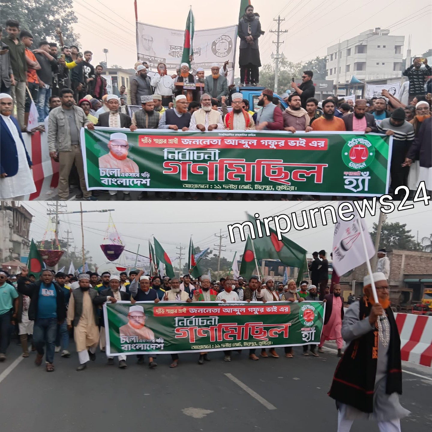 তারুণ্যের প্রথম ভোট,দাড়িপাল্লার পক্ষে হোক।মা বোনদের প্রথম ভোট,দাড়িপাল্লার পক্ষে হোক।ইনসাফের প্রথম ভোট,দাড়িপাল্লার পক্ষে হো।এমন মূহুর্মূহু শ্লোগানে কুষ্টিয়ার মিরপুরে দাড়িপাল্লা প্রতীকের প্রার্থী আলহাজ্ব আব্দুল গফুরের পক্ষে নির্বাচনী গণমিছিল ও গণসমাবেশ অনুষ্ঠিত হয়েছে। ১১দলীয় জোটের আয়োজনে আজ রবিবার (৮ফেব্রুয়ারী) বিকেলে মিরপুর উপজেলা পরিষদ সংলগ্ন ফুটবল মাঠ হতে এক বিশাল গণমিছিল বের হয়ে মিরপুর পৌর এলাকার বিভিন্ন সড়ক প্রদক্ষিন শেষে মিরপুর নতুন বাসষ্ট্যান্ড এলাকায় এসে শেষ হয়।পরে সেখানে এক বিশাল গণসমাবেশ অনুষ্ঠিত হয়। সমাবেশে প্রধান অতিথির বক্তব্যে জামায়াত মনোনীত দাড়িপাল্লা প্রতীকের সংসদ সদস্য পদপ্রার্থী আলহাজ্ব আব্দুল গফুর বলেছেন বাংলাদেশ জামায়াতে ইসলামী মানবিক বাংলাদেশ গঠন করতে চায়,ইনসাফ পূর্ণ বাংলাদেশ গড়তে চায়।জামায়াত একটি গণতান্ত্রিক রাজনৈতিক দল হিসেবে সব সময় শান্তিপূর্ণ ও অংশগ্রহণমূলক রাজনীতিতে বিশ্বাস করে। কিন্তু সম্প্রতি বিভিন্ন ইউনিয়নে দলের নেতাকর্মীদের ওপর হয়রানি, বাধা ও ভীতি প্রদর্শনের চেষ্টা চলছে।তাই প্রশাসনের প্রতি এসব ঘটনার নিরপেক্ষ তদন্ত এবং দায়ীদের বিরুদ্ধে দ্রুত ব্যবস্থা নেওয়ার অনুরোধ জানাচ্ছি।এই মিরপুর ভেড়ামারায় কোন সন্ত্রাসীর আস্তানা থাকা চলবেনা।আমার ভাইবোনদের হুমকি দিবেন,এটা চলবেনা।ভোটারদের ভয় হুমকি দেয়া,এটা আপনারা ভূলে যান।নেতা-কর্মীদের উদ্দেশ্যে তিনি বলেন“আমরা ভয় পেয়ে পিছিয়ে যাব না। জনগণের ভোটাধিকার রক্ষার জন্য নির্বাচনী মাঠে শেষ মুহূর্ত পর্যন্ত লড়াই চালিয়ে যাব,ইনশাআল্লাহ।”মিছিল ও সমাবেশে বিশেষ অতিথি হিসেবে উপস্থিত ছিলেন কুষ্টিয়া জেলা জামাতের টিম সদস্য অধ্যাপক জোমারত আলী, জেলা প্রশিক্ষণ বিষয়ক সম্পাদক ড.নুরুল আমিন জসিম,মিরপুর উপজেলা জামায়াতের আমির খন্দকার রেজাউল করিম, নায়েবে আমীর শাহ আক্তার মামুন, সেক্রেটারী মাওলানা মহিউদ্দিন আহমেদ, সহকারী সেক্রেটারী মাওলানা গোলাম মোস্তফা, মাওলানা ওমর ফারুক,ডা.রফিকুল ইসলাম প্রমুখ। এ সময় মিরপুর উপজেলা,পৌর ও বিভিন্ন ইউনিয়ন জামায়াতের নেতা-কর্মীরা উপস্থিত ছিলেন।