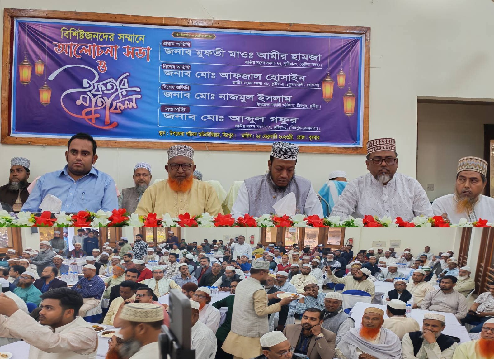 কুষ্টিয়ার মিরপুরে বাংলাদেশ জামায়াতে ইসলামীর আয়োজনে আলোচনা সভা ও ইফতার মাহফিল অনুষ্ঠিত হয়েছে। বুধবার (২৫ ফেব্রুয়ারী) বিকেলে মিরপুর উপজেলা পরিষদ অডিটোরিয়ামে এ ইফতার মাহফিল অনুষ্ঠিত হয়। বাংলাদেশ জামায়াতে ইসলামী কুষ্টিয়া জেলা শাখার ভারপ্রাপ্ত আমীর ও কুষ্টিয়া-২ (মিরপুর – ভেড়ামারা) আসনের জাতীয় সংসদ সদস্য আব্দুল গফুরের সভাপতিত্বে মিরপুর উপজেলার সরকারী কর্মকর্তাবৃন্দ, রাজনৈতিক নেতৃবৃন্দ,বুদ্ধিজীবি,সাংবাদিক, শিক্ষাবিদ, কবি-সাহিত্যিক, ব্যবসায়ী, উলামা মাশায়েখ ও বিশিষ্ট ব্যক্তিবর্গের সম্মানে আয়োজিত এ আলোচনা সভা ও ইফতার মাহফিলে প্রধান বক্তা হিসাবে উপস্থিত ছিলেন কুষ্টিয়া-৩ (সদর) আসনে জাতীয় সংসদ সদস্য মাওঃ মুফতি আমির হামজা। বিশেষ অতিথি হিসেবে উপস্থিত ছিলেন কুষ্টিয়া-৪ (খোকসা-কুমারখালী) আসনের সংসদ সদস্য আফজাল হোসাইন ও মিরপুর উপজেলা নির্বাহী কর্মকর্তা নাজমুল হোসাইন। এ সময় অন্যান্যদের মধ্যে উপস্থিত ছিলেন মিরপুর প্রেসক্লাবের সভাপতি মারফত আফ্রিদি, মিরপুর উপজেলা কৃষি কর্মকর্তা আব্দুল্লাহ আল মামুন, উপজেলা প্রাণী সম্পদ কর্মকর্তা আব্দুল্লাহেল কাফি, মিরপুর থানার ভারপ্রাপ্ত কর্মকর্তা শহীদুল ইসলাম, মিরপুর উপজেলা প্রকৌশলী জহির মেহেদী হাসান, উপজেলা প্রকল্প বাস্তবায়ন কর্মকর্তা মাহফুজুর রহমান, সাজসেবা কর্মকর্তা জামশেদ আলী, উপজেলা মৎস্য কর্মকর্তা আবুল কালাম আজাদ সহ জামায়াতের বিভিন্ন পর্যায়ের নেতা-কর্মীবৃন্দ। উল্লেখ্য মিরপুর উপজেলা বিএনপির কোন নেতৃবৃন্দ উপস্থিত না থাকলেও মিরপুর উপজেলার প্রায় সকল ইউনিয়ন পরিষদের আওয়ামী লীগ পন্থী চেয়ারম্যান ও আওয়ামী লীগের বিভিন্ন পর্যায়ের নেতা-কর্মীরা উপস্থিত ছিলেন।