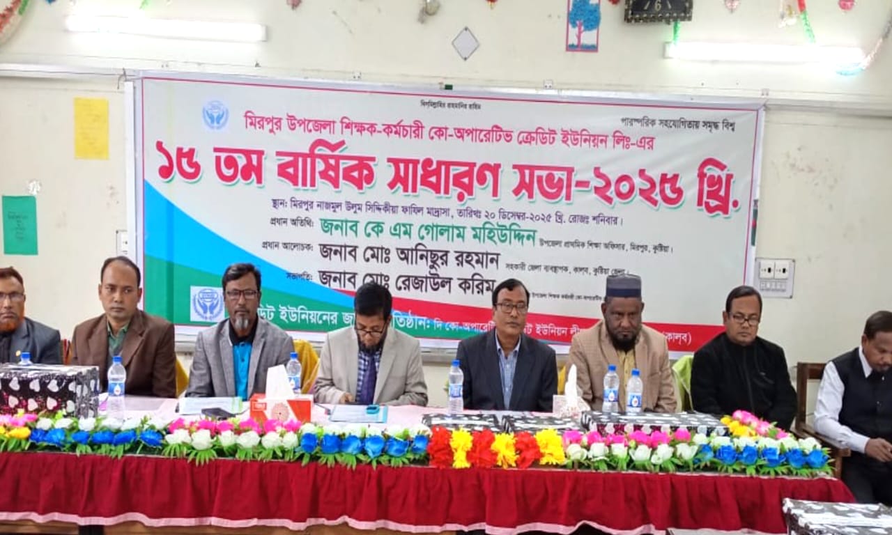 কুষ্টিয়ার মিরপুর উপজেলা শিক্ষক-কর্মচারী কো-অপারেটিভ ক্রেডিট ইউনিয়ন লিমিটেডের ১৫তম বার্ষিক সাধারণ সভা–২০২৫ যথাযথ মর্যাদা ও উৎসবমুখর পরিবেশে অনুষ্ঠিত হয়েছে। শনিবার (২০ ডিসেম্বর) সকাল ১০টায় মিরপুর নাজমুল উলুম সিদ্দিকীয়া ফাযিল মাদ্রাসা প্রাঙ্গণে এ সভা অনুষ্ঠিত হয়।