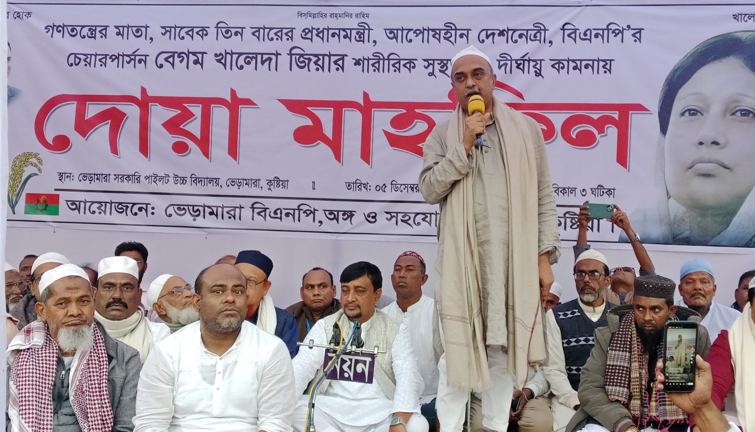 সাবেক প্রধানমন্ত্রী, বিএনপির চেয়ারপারসন বেগম খালেদা জিয়ার শারীরিক সুস্থতা ও দীর্ঘায়ু কামনায় ভেড়ামারা উপজেলা বিএনপি ও অঙ্গসংগঠনের আয়োজনে গতকাল শুক্রবার বিকেলে ভেড়ামারা সরকারি পাইলট উচ্চ বিদ্যালয় মাঠে দোয়া মাহফিল অনুষ্ঠিত হয়েছে। দোয়া অনুষ্ঠানের প্রধান অতিথি ছিলেন কুষ্টিয়া-২ (ভেড়ামারা- মিরপুর) আসনের বিএনপি মনোনিত সংসদ সদস্য পদপ্রার্থী ব্যারিস্টার রাগীব রউফ চৌধুরী।  দোয়া মাহফিলে হাজার হাজার পুরুষ-নারী কর্মীরা বেগম জিয়ার সুস্থ্যতার জন্য আল্লাহর দরবারে হাত তুলে দোয়া করছেন। প্রধান অতিথি রাগীব রউফ চৌধুরী বলেন- ফ্যাসিস্ট হাসিনা সরকার ১৬ বছর এই জনপ্রিয় দল বিএনপিকে নিশ্চিহ্ন করার জন্য নেতাকর্মীদেরকে গুম, খুন, হামলা-মামলা সহ এমন কোন ধরনের নির্যাতন নেই যা তারা করে নাই। এত অত্যাচারের পরেও একটি কর্মীও বিএনপি থেকে চলে যায় নাই। ঠিক তেমনি এখন যারা স্বপ্ন দেখছেন তারেক রহমান দেশে আসেন নাই বলে দলের মধ্যে সংকট হবে বা বিএনপির ক্ষতি হবে। বিএনপির বিরুদ্ধে যত ষড়যন্ত্র হোক না কেন খালেদা জিয়া সুস্থ হতে সময় লাগুক না কেন তারেক রহমান দেশে যখন আসুক না কেন বিএনপির মধ্যে কোন সংকট সৃষ্টি হবে না। আমরা বিএনপির সাধারণ কর্মী হিসেবে একটাই আমাদের দায়িত্ব দেশীয় ও আন্তর্জাতিক ষড়যন্ত্রকে শক্ত হাতে দমন করতে হবে এবং পাশাপাশি ধানের শীষের পক্ষে সবাইকে কাজ করতে হবে। বিশেষ অতিথি ছিলেন ভেড়ামারা উপজেলা বিএনপির সদস্য সচিব শাহাজান আলী, কুষ্টিয়া জজ কোর্টের পিপি খন্দকার সিরাজুল ইসলাম, জিপি এ্যাড: মাহাতাব উদ্দিন, উপজেলা বিএনপির আহবায়ক কমিটির সদস্য শিহাবুল ইসলাম, মনুজুর আলম দুলাল, উপজেলা যুবদলের সদস্য সচিব  মোশারফ হোসেন, ভেড়ামারা পৌর বিএনপির আহবায়ক  হাফিজুর রহমান জিন্নাহ, ধরমপুর ইউনিয়ন বিএনপি নেতা হাজী শামসুল হক, যুগ্ম সাধারণ সম্পাদক আব্দুল মান্নান, উপজেলার স্বেচ্ছাসেবক দলের আহ্বায়ক মনিরুজ্জামান জুয়েল, সদস্য সচিব এস এস আল হুসাইন সোহাগ, যুগ্ন আহবায়ক রাজন আলী, পৌর স্বেচ্ছাসেবক দলের  সদস্য সচিব নাহারুল ইসলাম বকুল, উপজেলা ছাত্রদলের সদস্য সচিব ওয়াসিম আকরাম, মোকারিমপুর ইউনিয়ন যুবদলের সবেক সাংগঠনিক সম্পাদক জান মহাম্মদ। অনুষ্ঠানের সভাপতিত্ব করেন মোকারিমপুর ইউনিয়ন বিএনপির সভাপতি শাহাদত হোসেন। অনুষ্ঠান সঞ্চালনায় ছিলেন আতিয়ার রহমান।